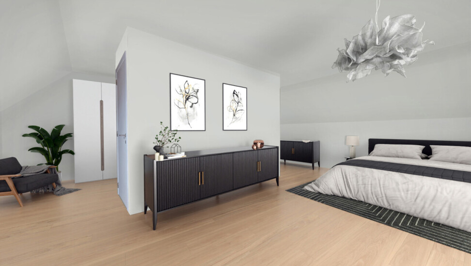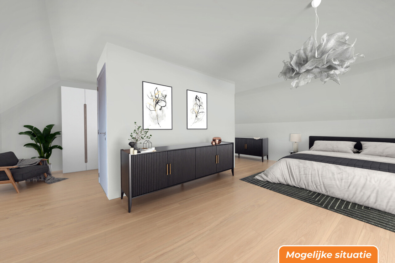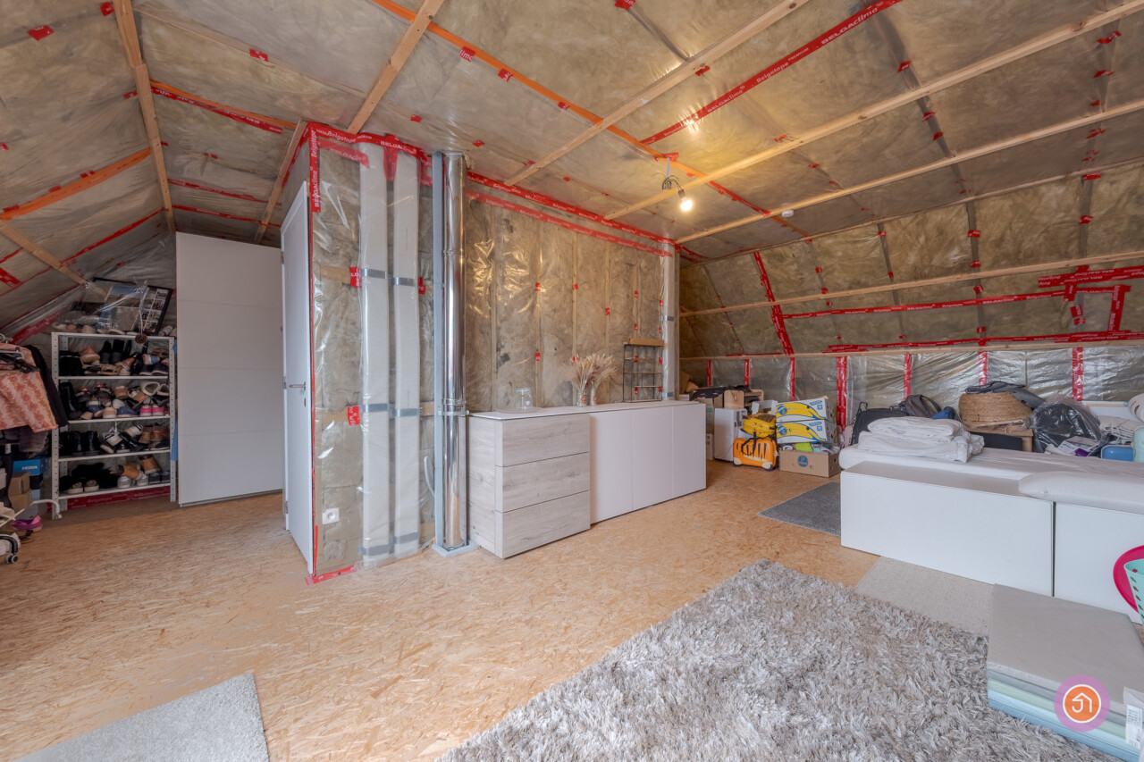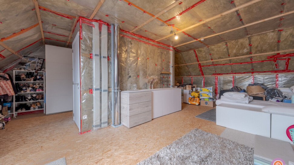 Via een vaste trap in de nachthal bereiken we de ruime zolder (52m²) die mogelijkheden biedt voor het creëren van een extra slaapkamer.
