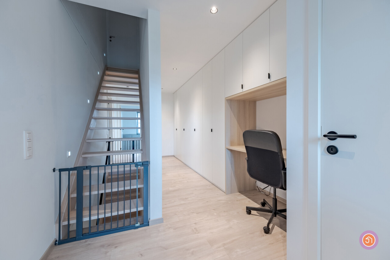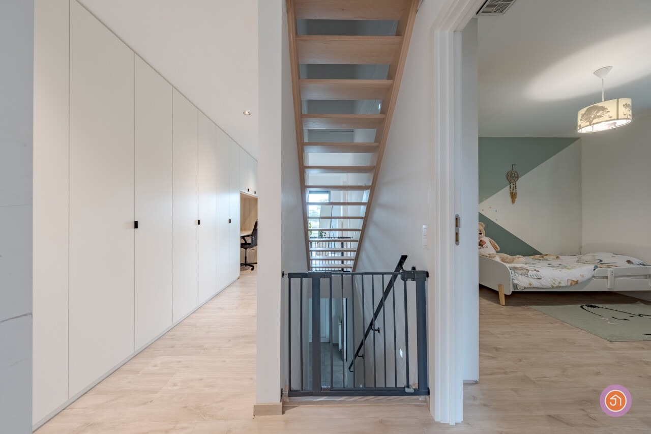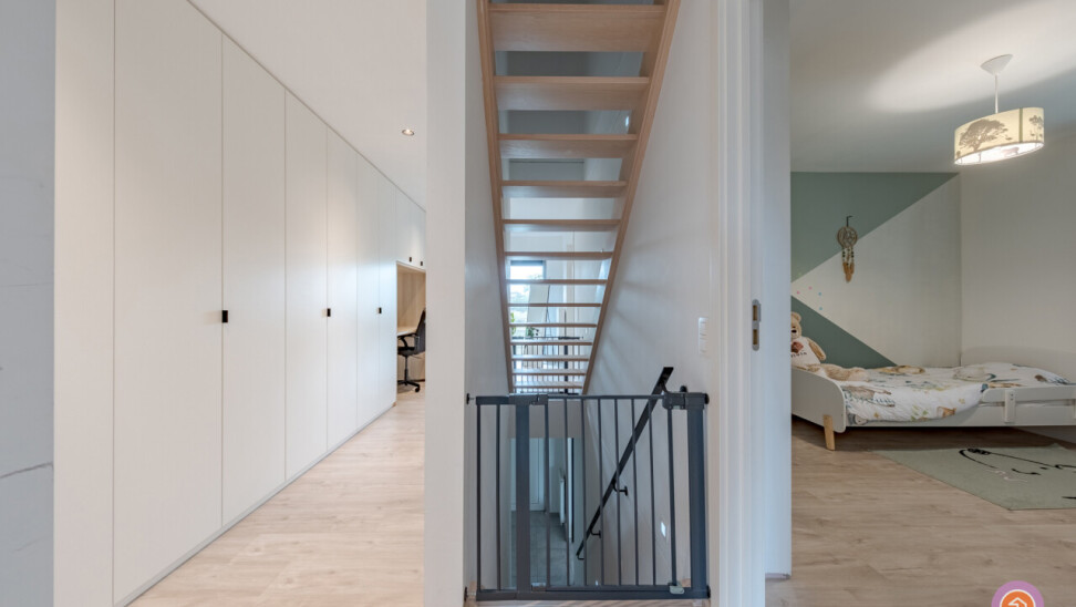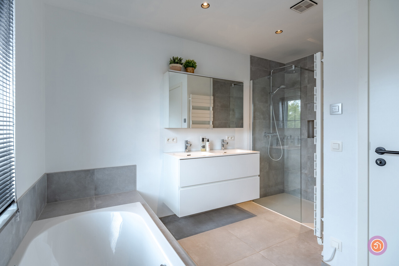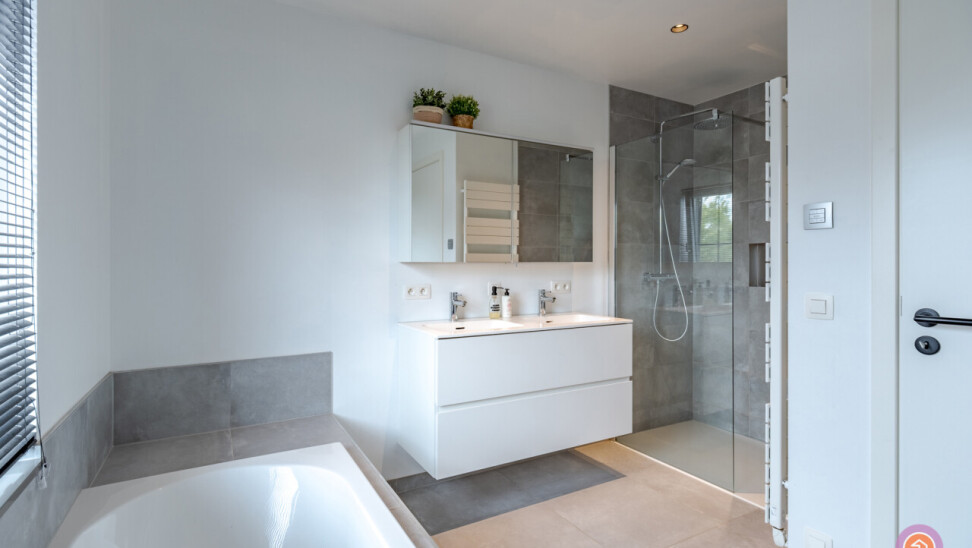 Via de trap in de hal bereiken we de eerste verdieping waar zich drie slaapkamers, een apart toilet en een badkamer bevinden. De badkamer voorziet in een ligbad, inloopdouche en een dubbele lavabo. Als extra troef is de nachthal volledig voorzien van ingemaakte kasten en een bureau.