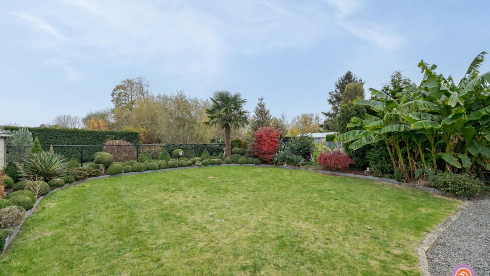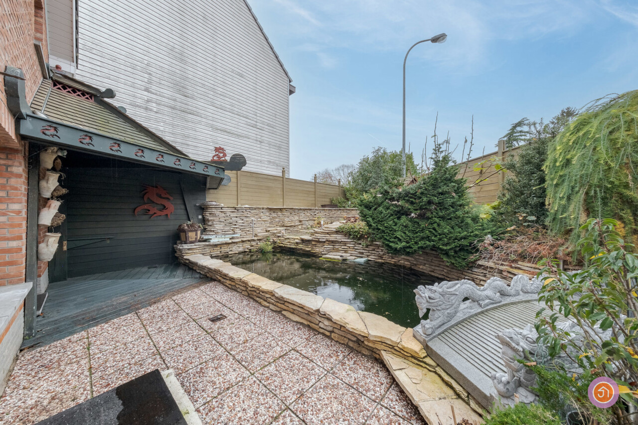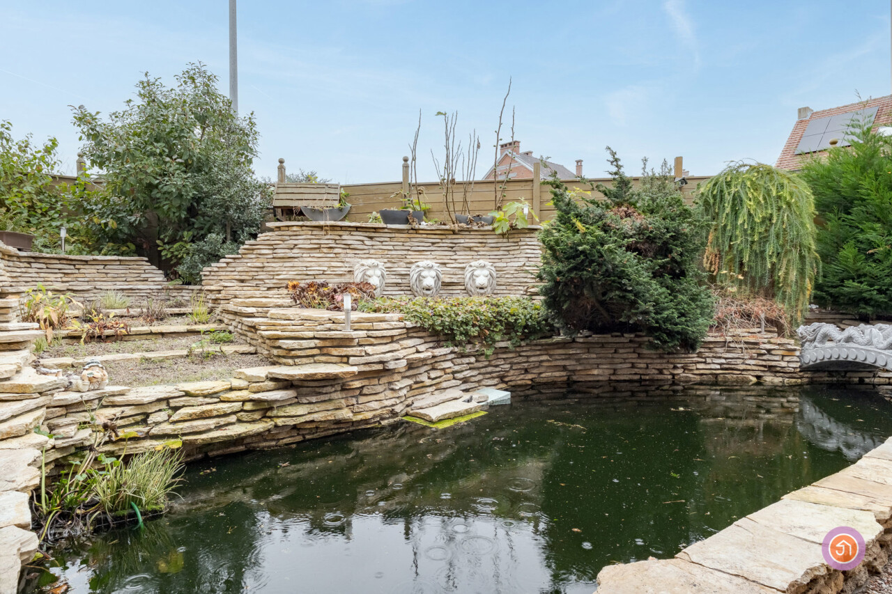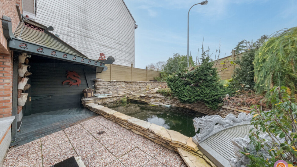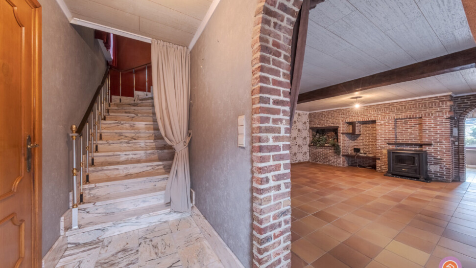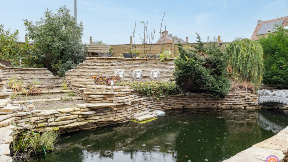 We komen binnen via de inkomhal die toegang geeft tot de gezellige en ruime leefruimte. Aansluitend bevindt zich de keuken met toegang tot het deels overdekt terras. Hier kan je genieten van een aperitiefje met zicht op de vijver.
