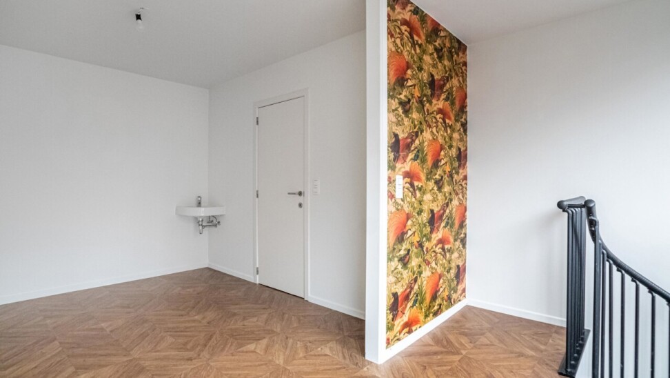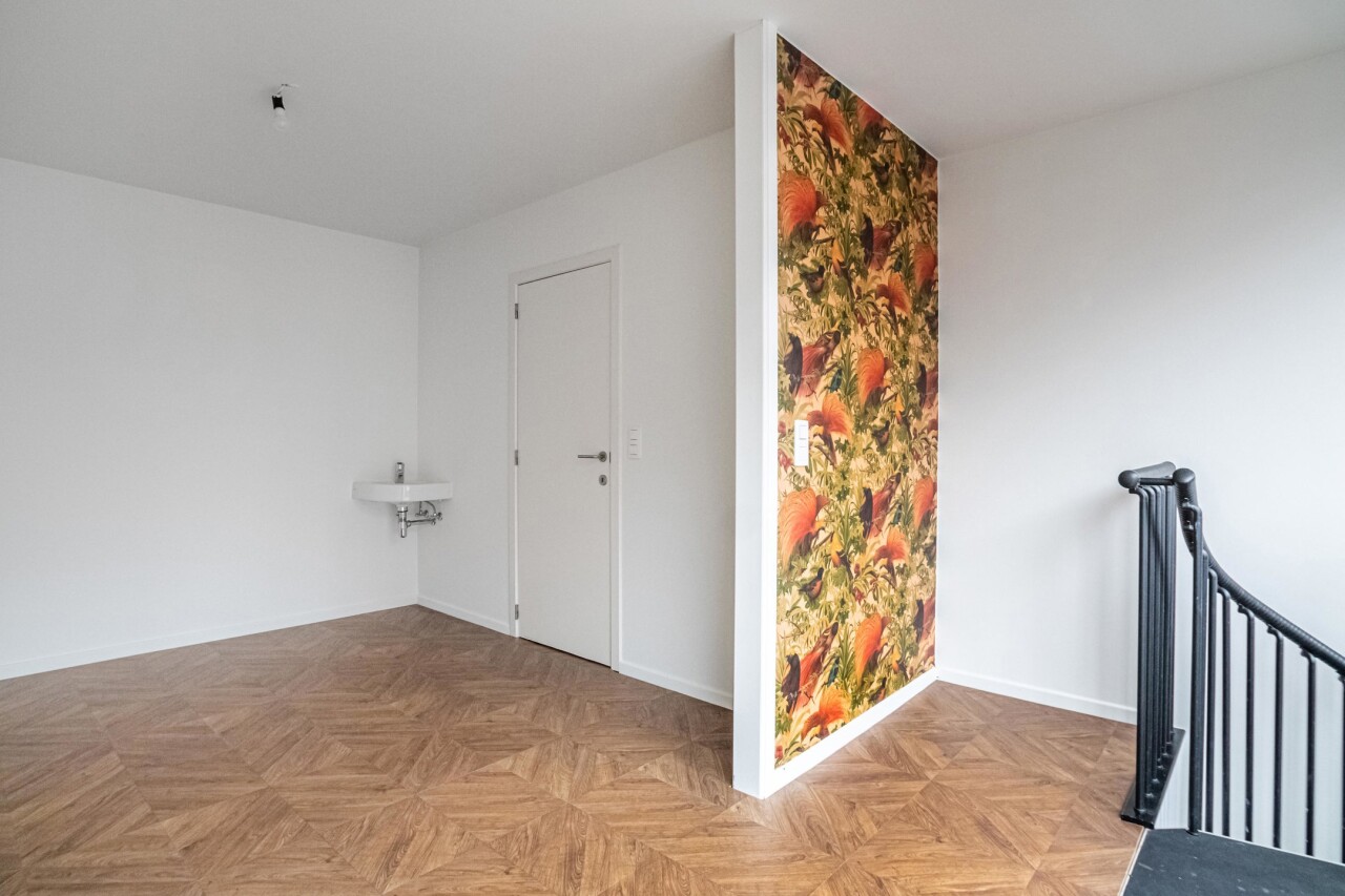De trap in deze ruimte biedt toegang tot de verdieping, waar we een tweede ruimte terugvinden en een douchekamer.