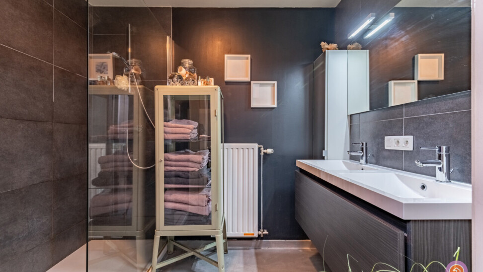 Wanneer we de nachthal betreden, vinden we aan onze linkerkant een gastentoilet. De hal geeft eveneens toegang tot de twee volwaardige slaapkamers en de badkamer voorzien van een inloopdouche en dubbele lavabo.