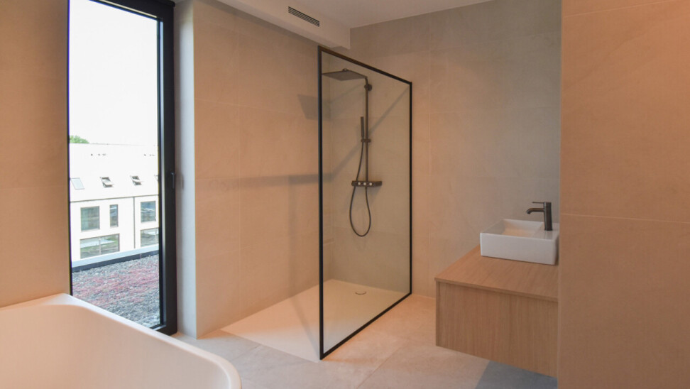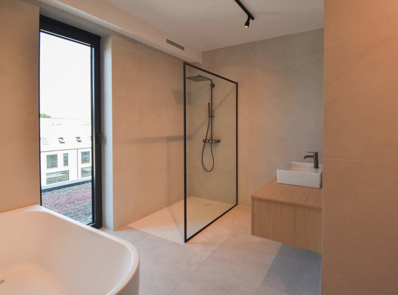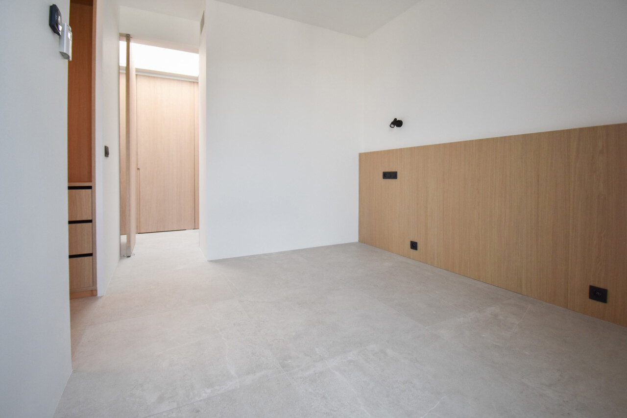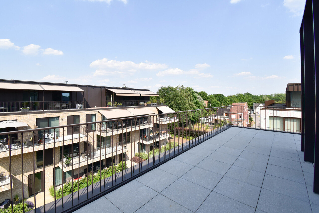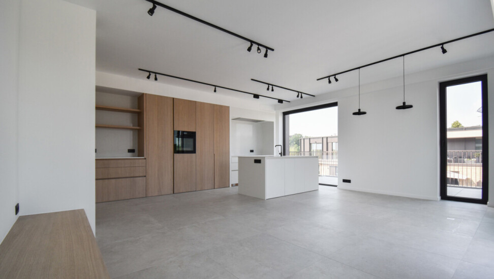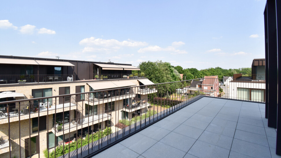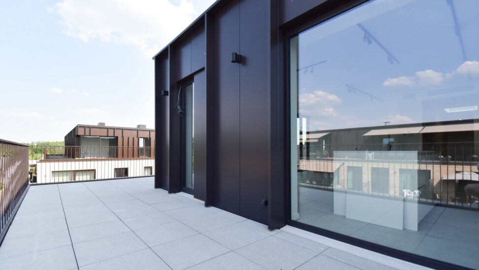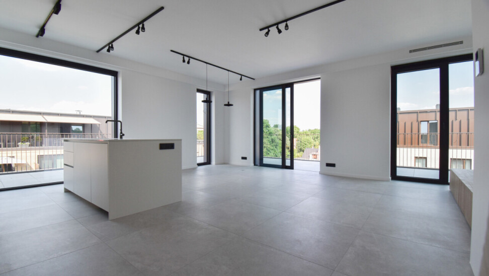 De grote raampartijen in de leefruimte geven toegang tot het riante terras van 48m² waar je de volledige dag kan genieten van het zonnetje.