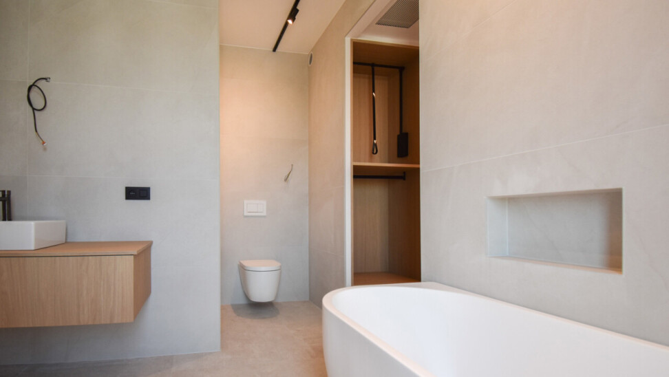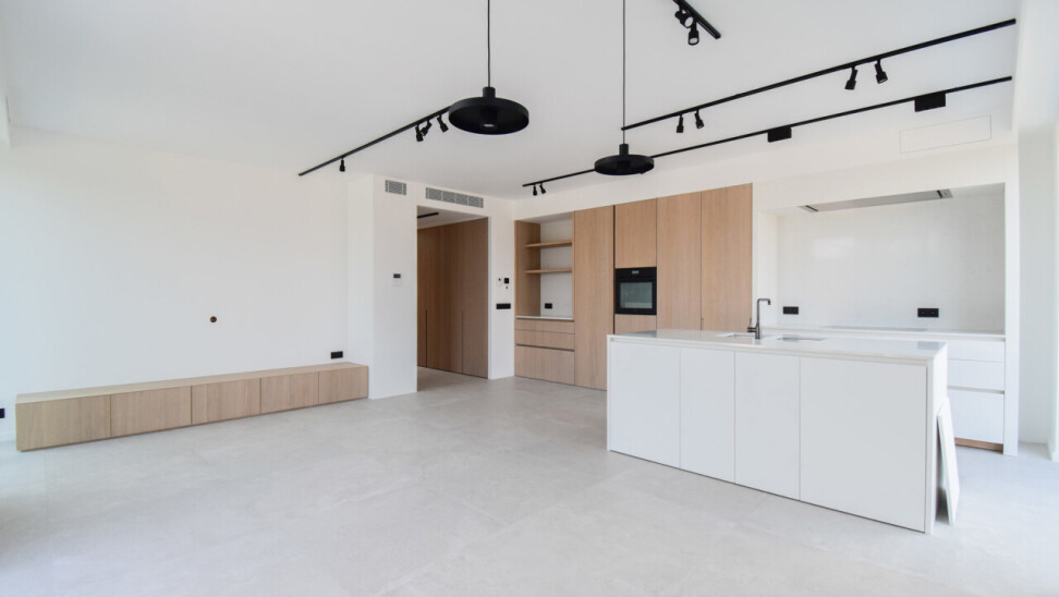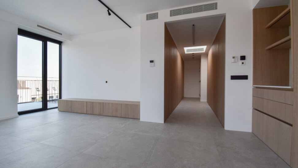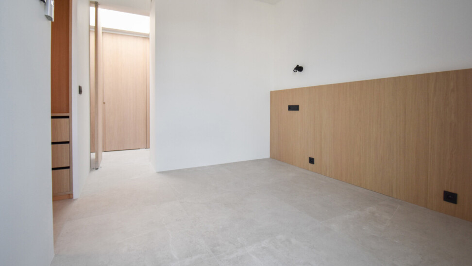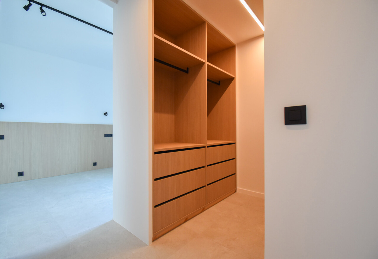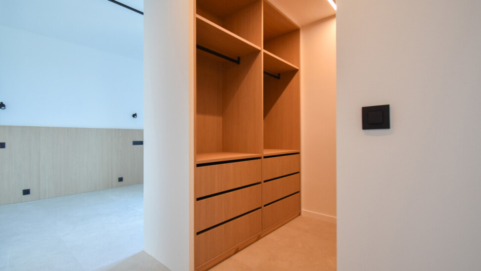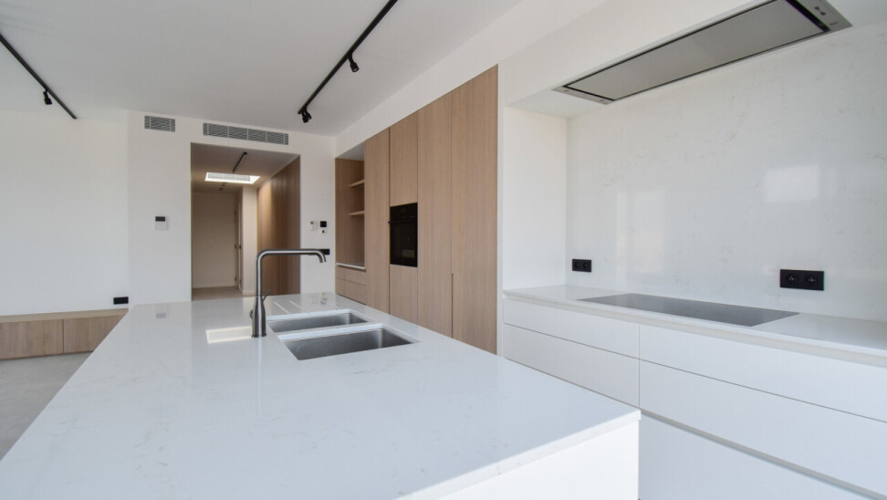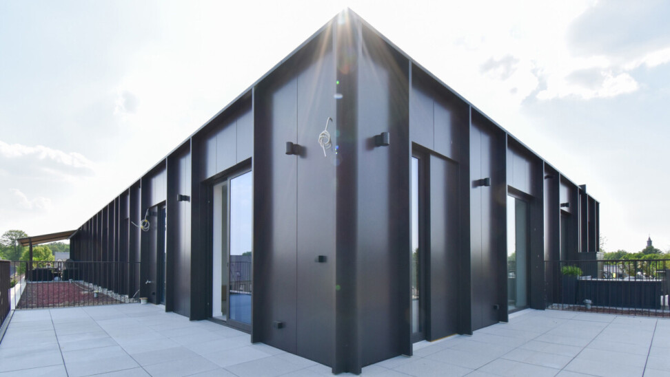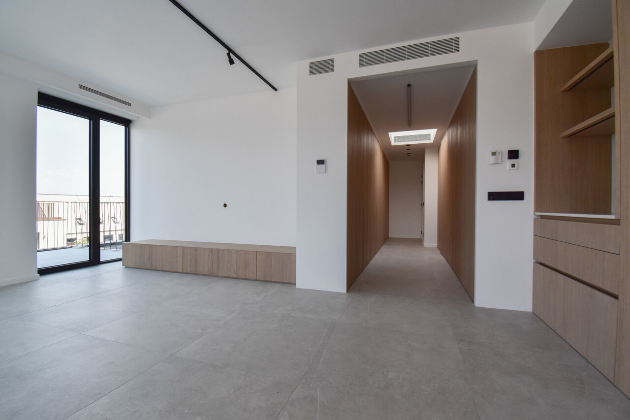 De grote raampartijen in de leefruimte geven toegang tot het riante terras van 48m² waar je de volledige dag kan genieten van het zonnetje.