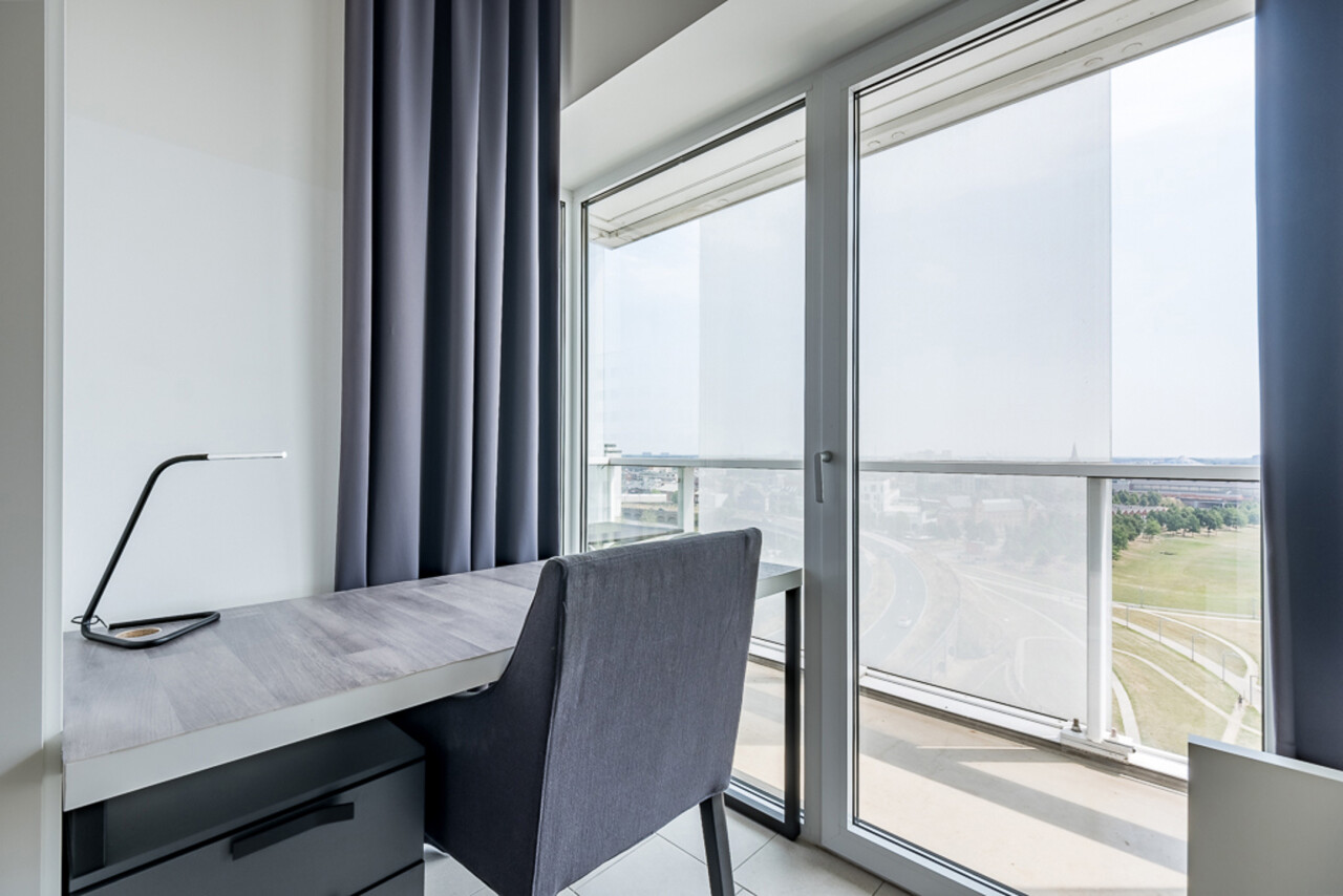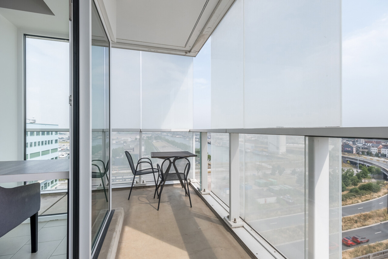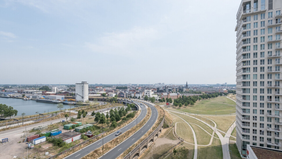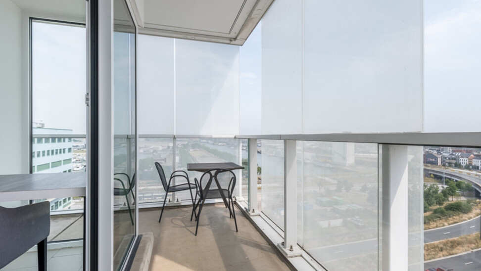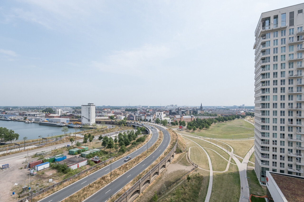 De grote raampartijen zorgen voor voldoende lichtinval en geven toegang tot het ruime terras van 18,8 m² met zicht op de skyline van Antwerpen en het Park Spoor Noord.