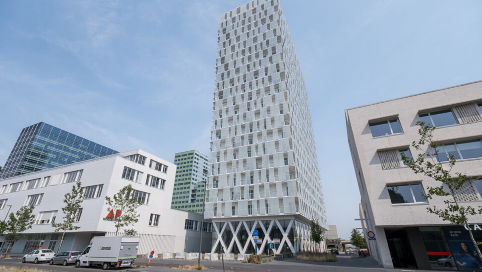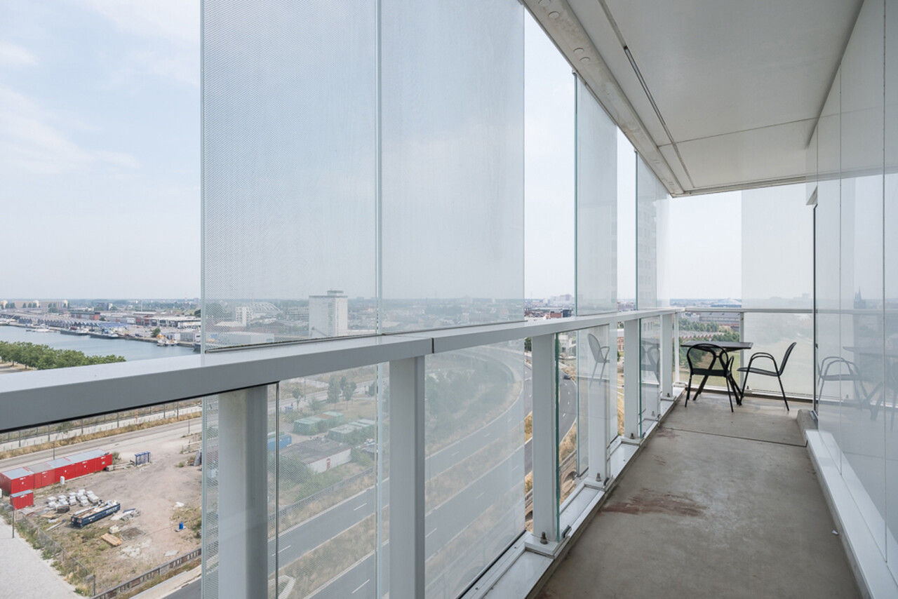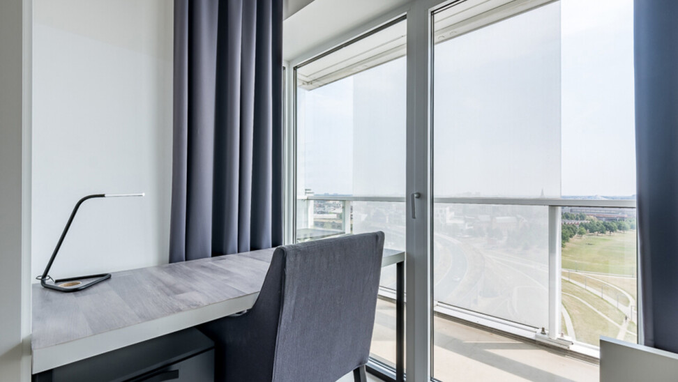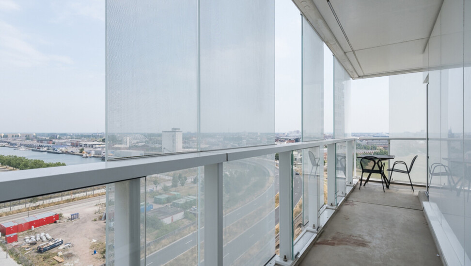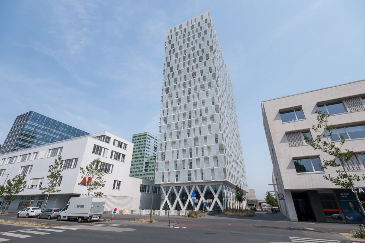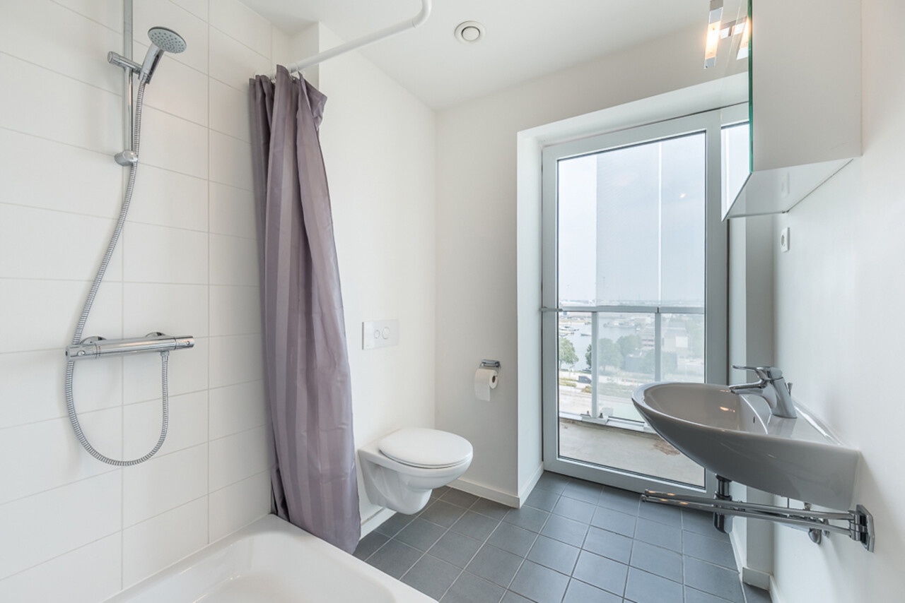 De grote raampartijen zorgen voor voldoende lichtinval en geven toegang tot het ruime terras van 18,8 m² met zicht op de skyline van Antwerpen en het Park Spoor Noord.