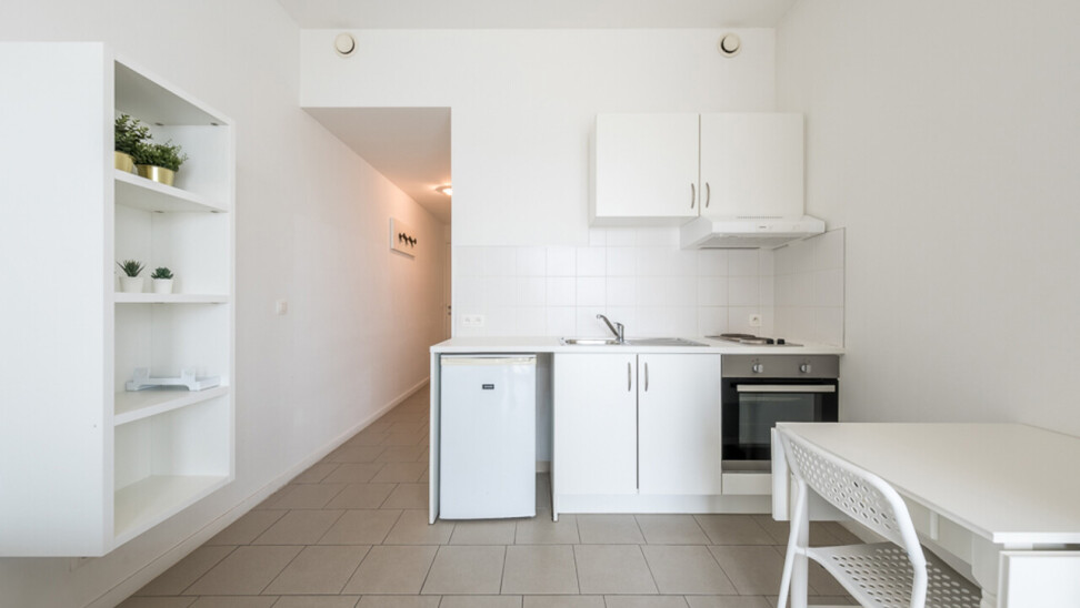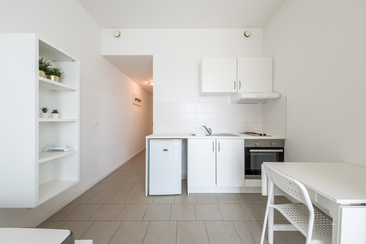 We betreden de studentenkamer via een inkomhal die toegang geeft tot de badkamer voorzien van lavabo, douche en toilet. Wanneer we doorlopen betreden we de kamer voorzien van een kitchenette met koelkast, kookplaat en oven. De meubels zijn inbegrepen.