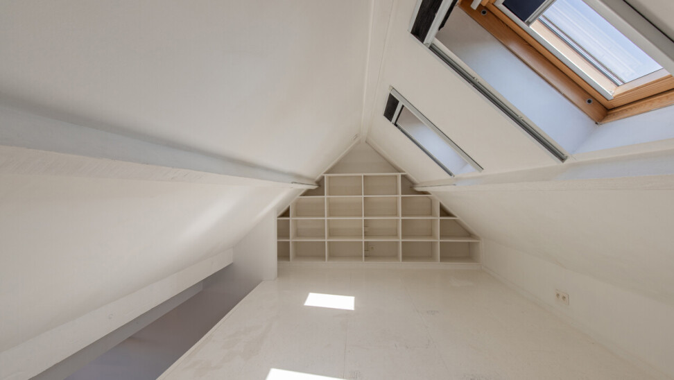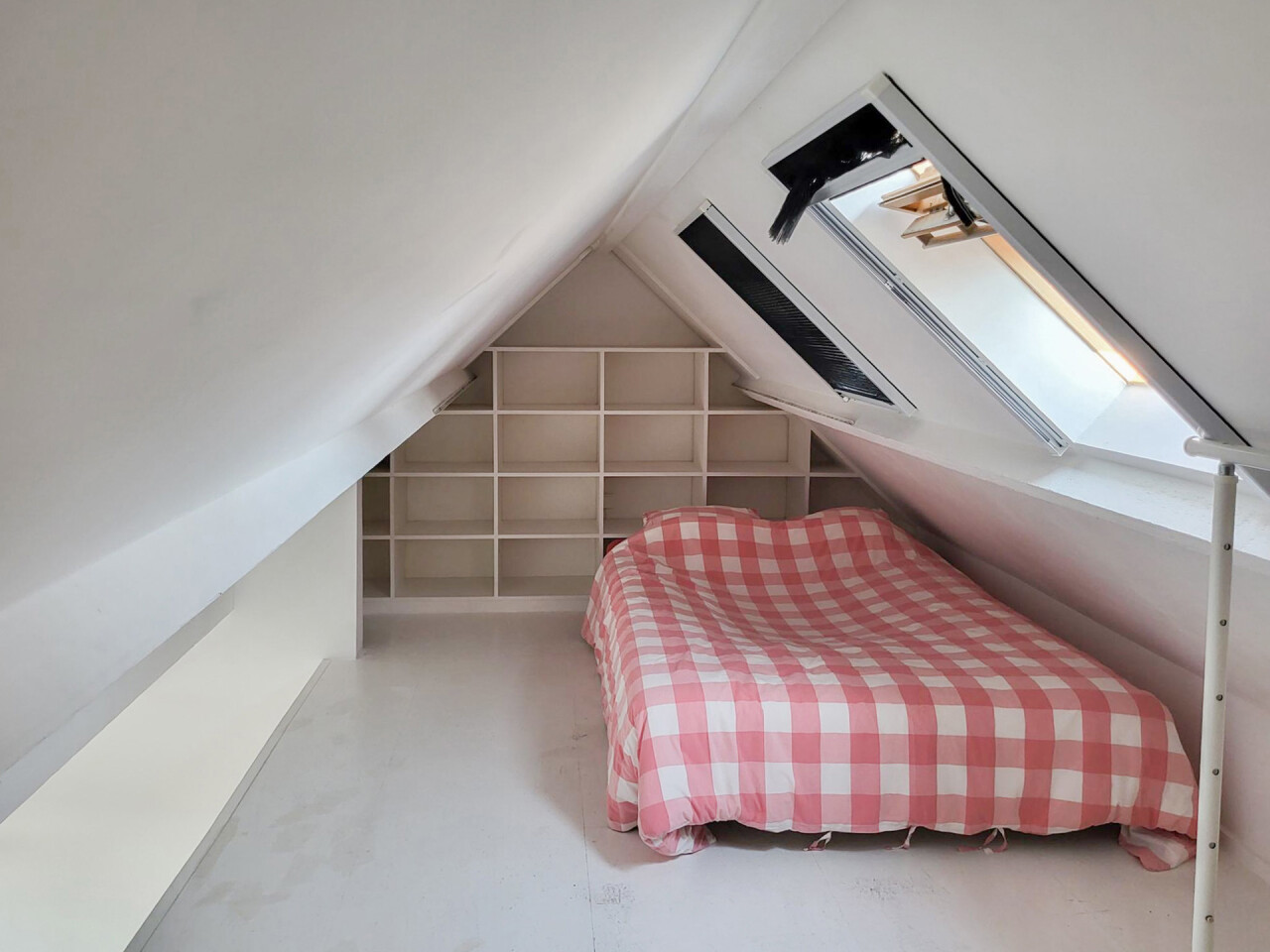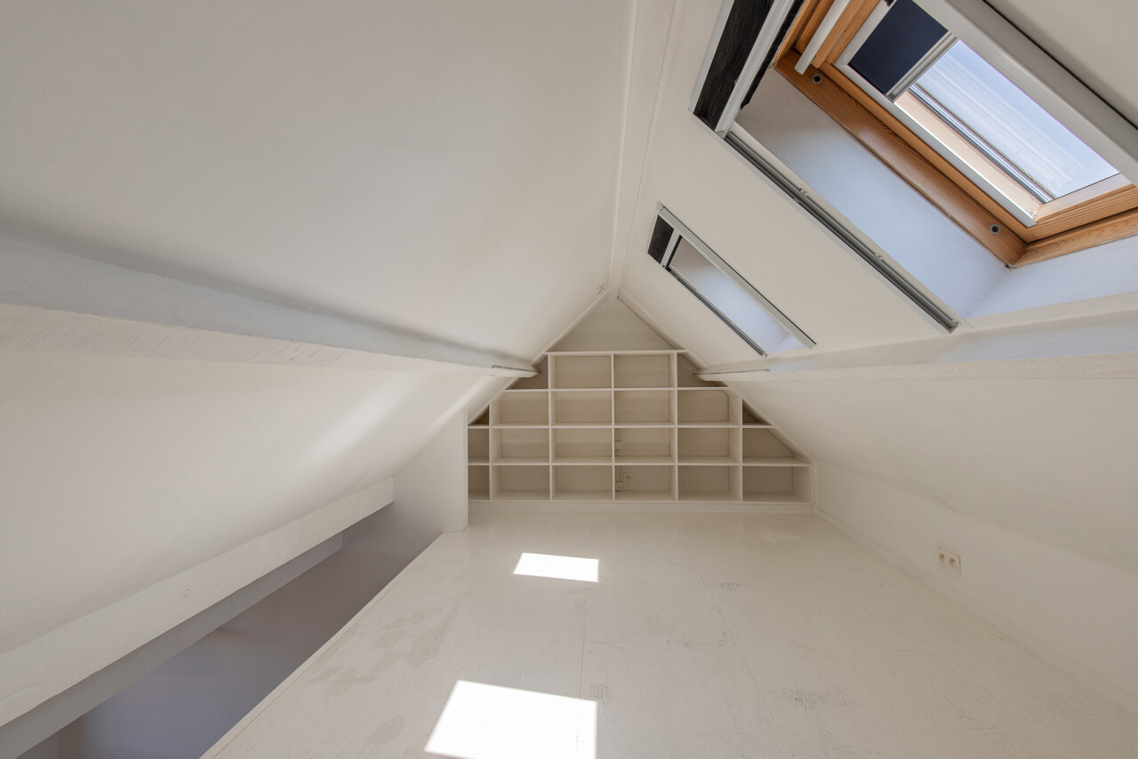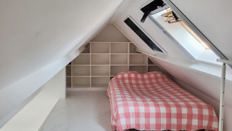De trap in de leefruimte geeft meteen toegang tot de gezellige slaaphoek, voorzien van opbergplanken. Deze ruimte kan echter ook dienst doen als bureau indien je beneden een slaapzetel (of-kast) plaatst.
