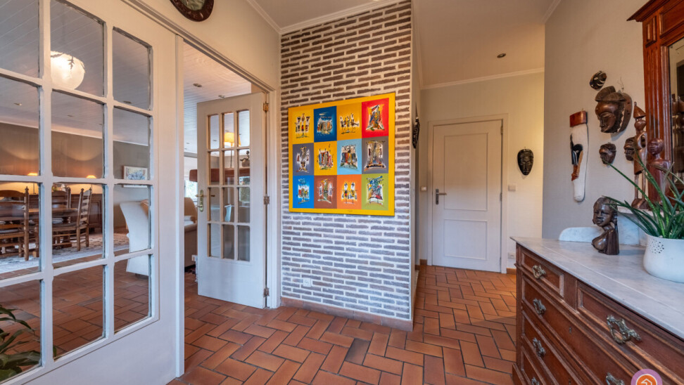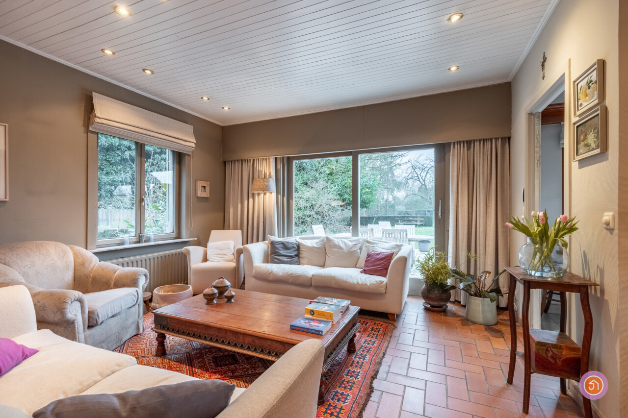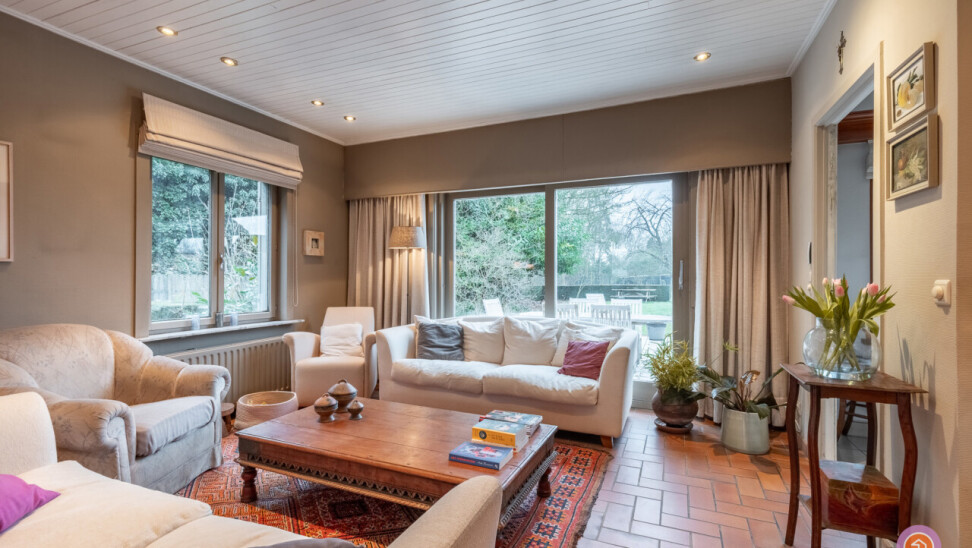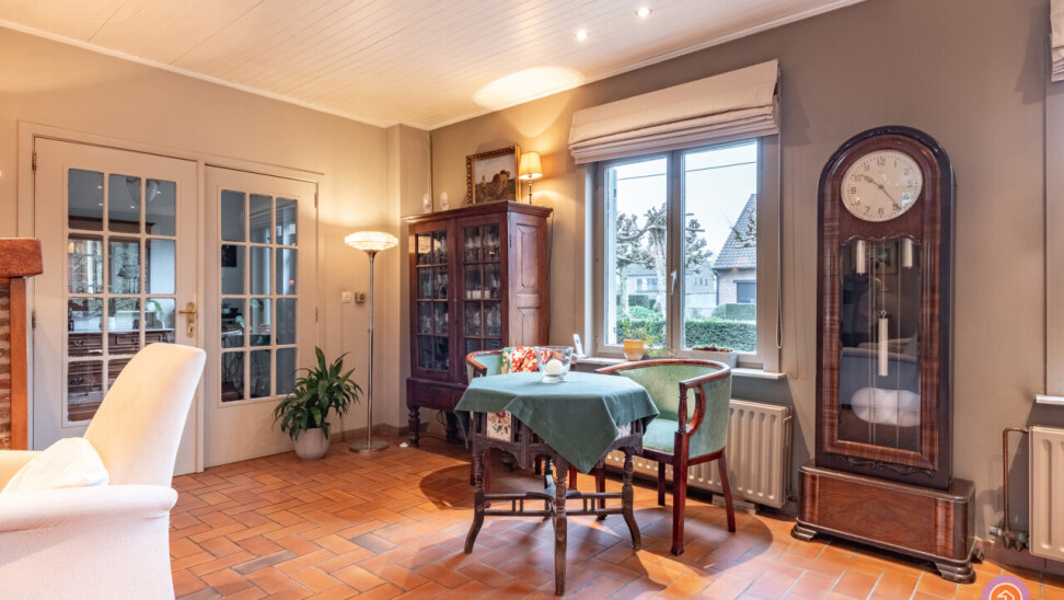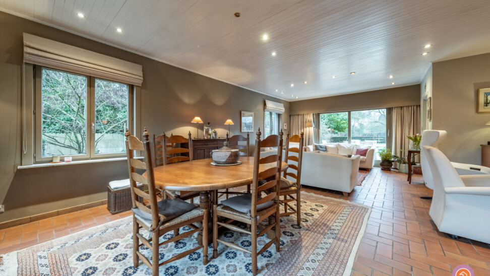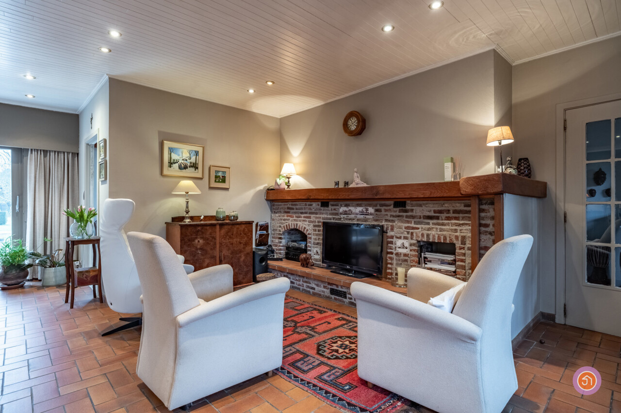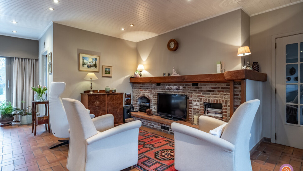 Bij het betreden van de woning kom je terecht in de inkomhal. Vanuit de inkomhal betreden we de ruime en open leefruimte met aansluitend de zeer uitgeruste keuken. Vanuit de salon heb je een prachtig zicht op de diepe tuin. Verder heb je nog een tweede zithoek rond de open haard, ideaal voor wie 's avonds van warme gezelligheid houdt.